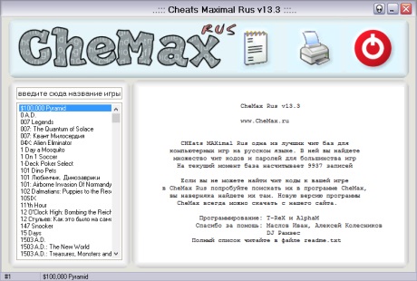 Бесплатная программа Chemax Rus 14.9 (Чемакс) - на данный момент наибольшая база чит кодов и паролей для популярных игр. Простой и удобный интерфейс и малый размер программы Chemax и огромное количество игр.